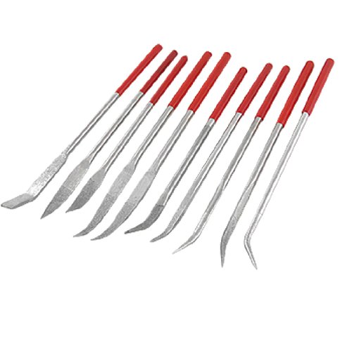 10 Pcs Diamond Needle Files in Different Profiles: flat curved, round curved, triangle curved,half round curved, square curved, etc.Safty and easy to use with the red plastic coated handle.For filing of curves and corners in hardened steel dies, glass, ceramic, rock, carbide, gold, platinum and other hard materials.